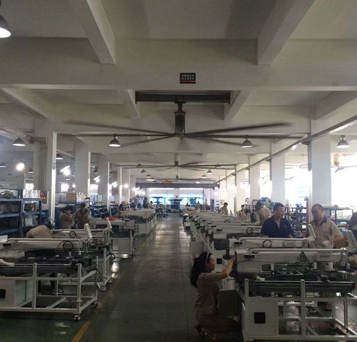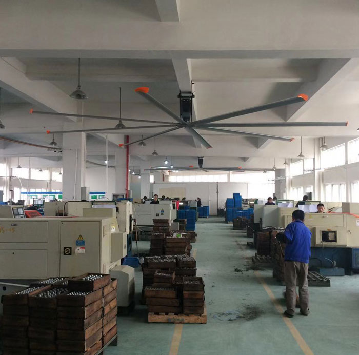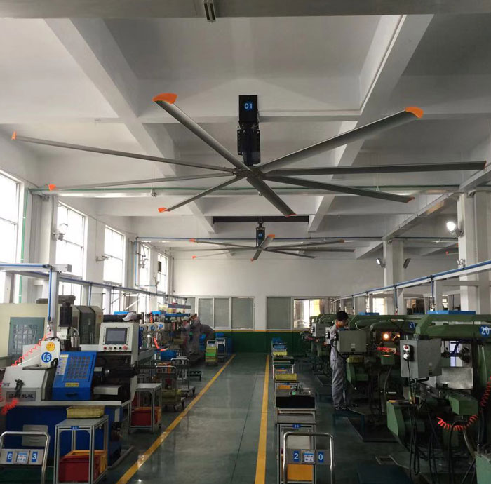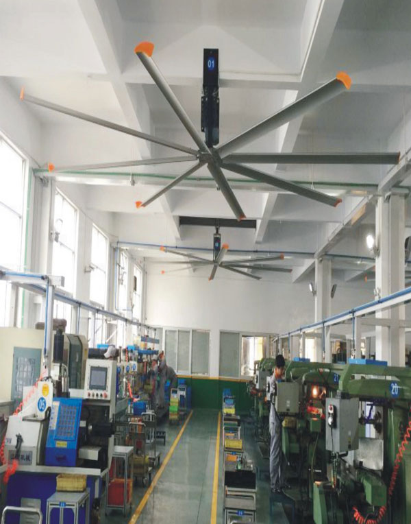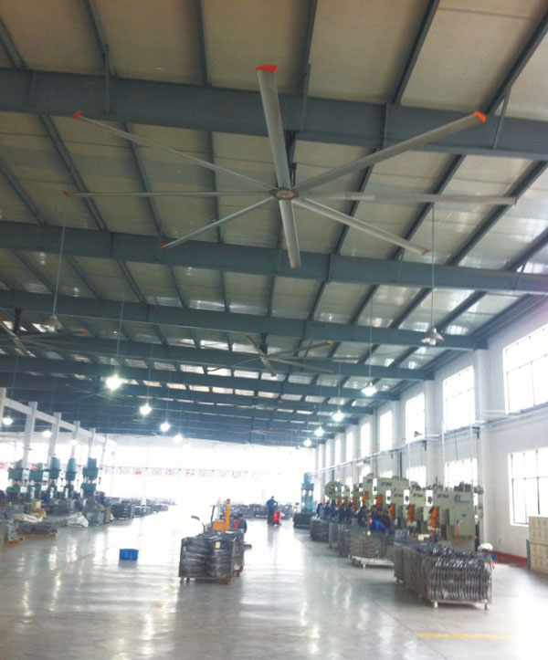我公司生產的大型工業吊扇直接懸掛在廠房屋梁下,風力柔和,能加快車間空氣流通,有效降低車間內溫度,改善車間空氣環(huán)境質量,有利于員工的身體健康。